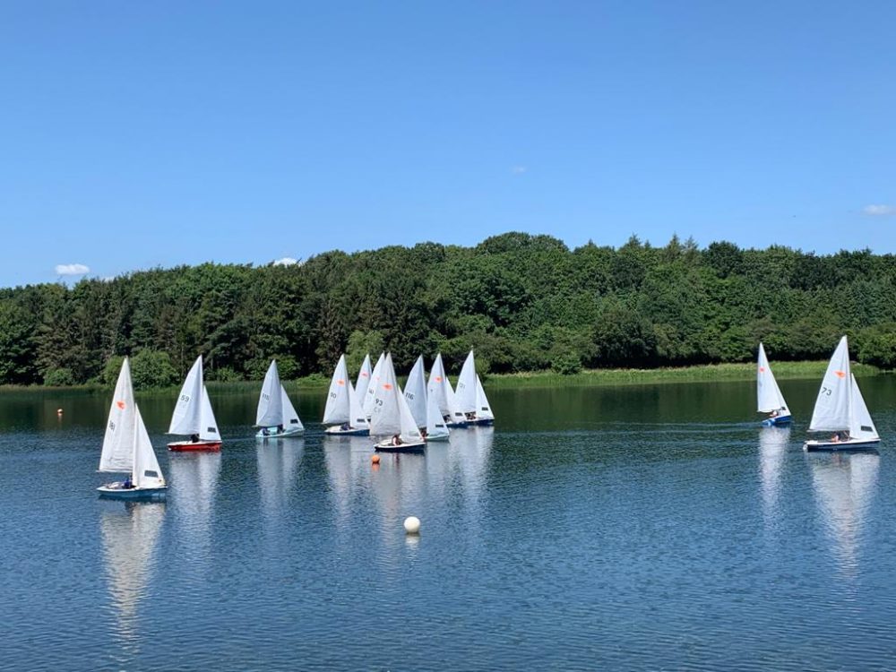 The wind was light – Force 0-2, with the occasional sudden summer gust catching 2 folk out (Jane and Ian).  The racing was very well organised and led to an enthralling first race, with young Tom Chapman and Georgie Hind (121) chasing and very nearly catching Nigel Austin and Polly Guyett (103).  Our visitor came in 3rd, very happy chappy.   The remaining competitors were not that far behind but to be fair had paired up with crews to get as many out on the water as possible to enjoy this prestigious event, and certainly the trim of some could have been better!