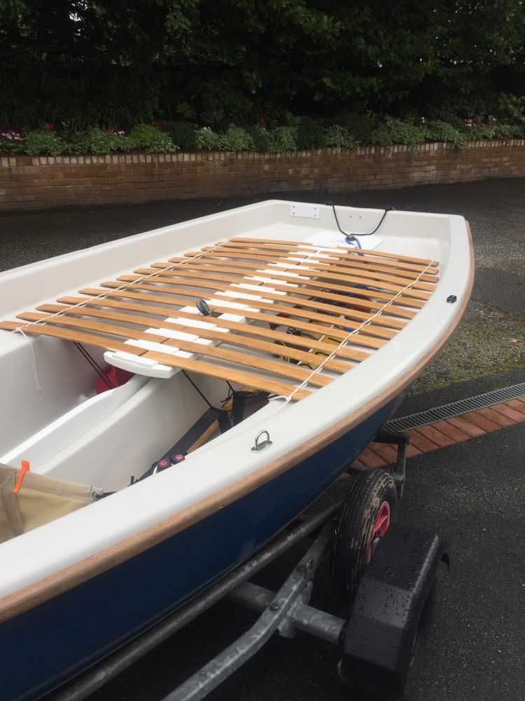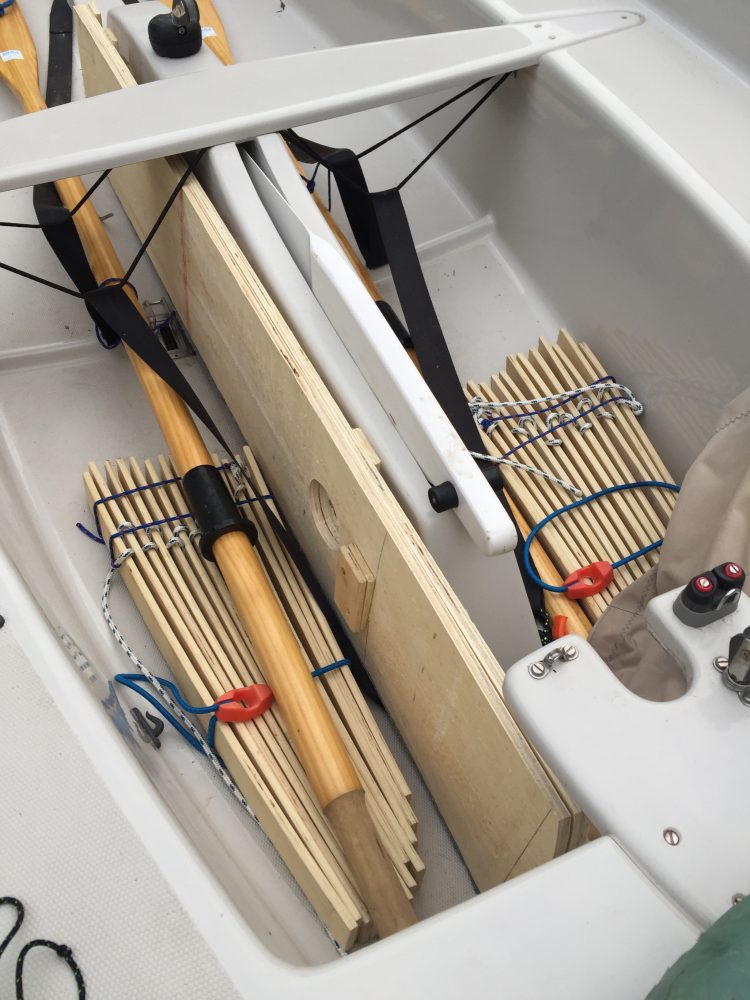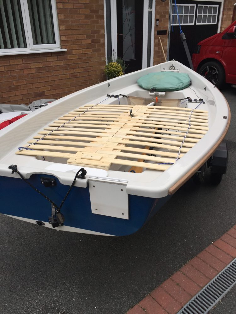 The inability to sleep aboard has now been rectified with a fairly comfortable arrangement by up-cyclling old bed slats, some plywood for central strength and rope to hold the slats to predefined positions.